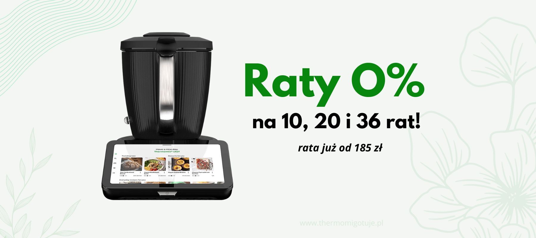 Po raz pierwszy dostępny jest Thermomix TM7 na raty 0% – aż do 36 miesięcy! To oznacza, że za urządzenie o wartości 6669 zł zapłacisz wygodnie w ratach już od 185,25 zł miesięcznie – bez odsetek, bez prowizji i bez ukrytych kosztów.
